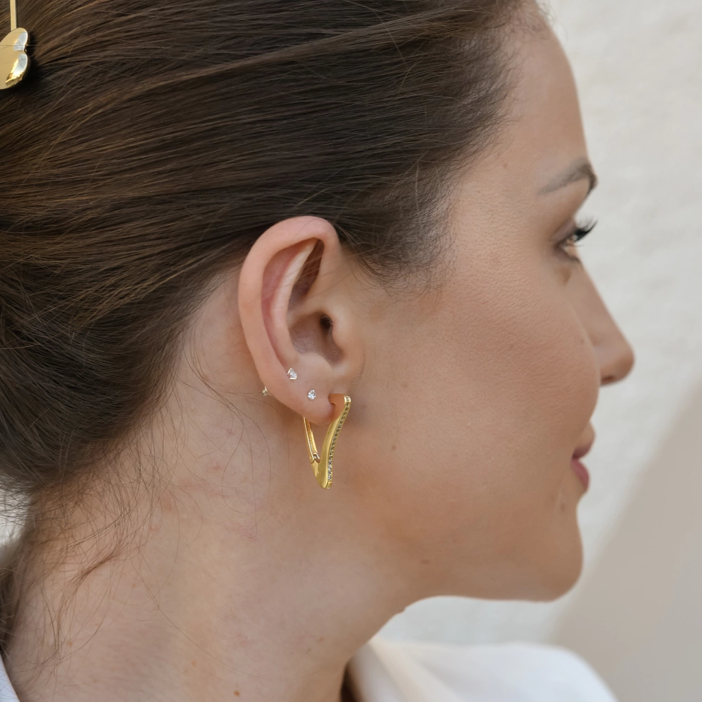 Argola V torta média fechada toda cravejada com 1 fileira de zircônias. Esse modelo de argola é super estilosa e moderna.