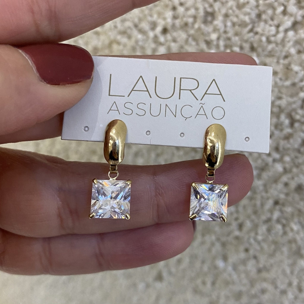 Brinco possui 2 cm de comprimento, zircônia mede 8x8 mm.